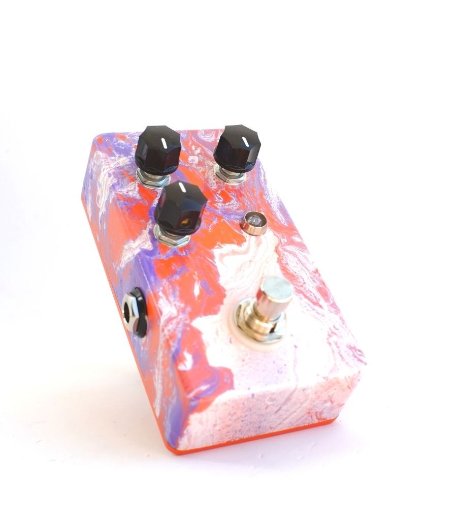 Handmade, hand soldered circuit. Handpainted using a japanese technique called suminagashi, where you apply the paint to water and then dip the pedal into the water.